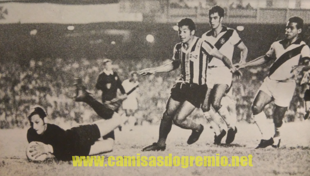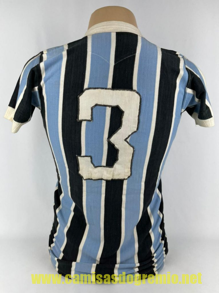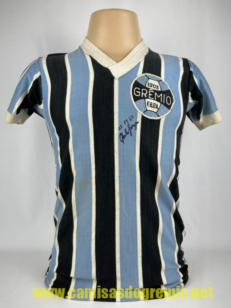 Raridade encontrada na coleção do Charles Müller e que também após inúmeras pesquisas não temos total certeza sobre seu ano. Coparei a disposição das listras, quantidade de listras, posição do símbolo, as bordas do símbolo com pôsteres encontrados no site do Gianfranco Spolaore e fotos encontradas no Acervo Histórico do Grêmio e nos pareceu bastante com a de 1967, mas devido a baixa qualidade das fotos da época não temos total certeza. Tentei encontrar alguma forma de entrar em contato com a Cauduro para ver se eles não saberiam informar o ano, mas não encontrei nenhum e-mail deles nem informações no Google. Gostaria de pedir ajuda a quem se interessar para descobrirmos o ano exato desta camisa também. Desde já agradeço!