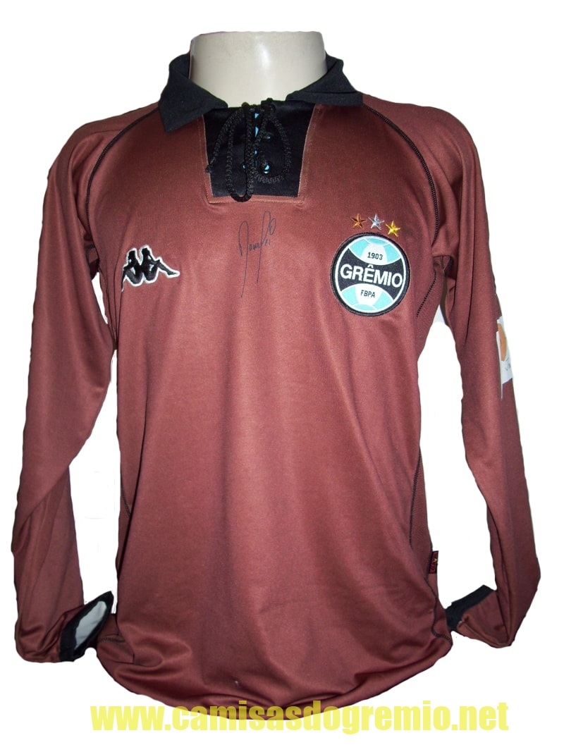 Comemorativa Eurico Lara, feita pela Kappa em 2003, ano do nosso centenário. A camisa abaixo, com o número 1 nas costas e o patch do Instituto do Câncer de Porto Alegre foi usada em jogo. Existem outras 2 versões desta camisa, todas em exibição aqui no blog.