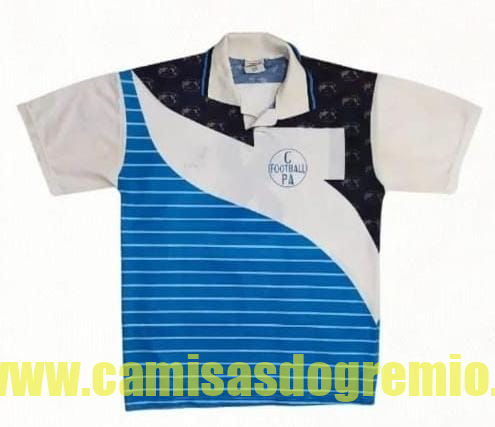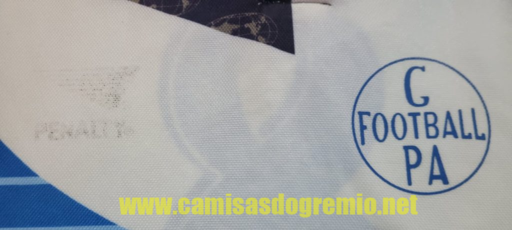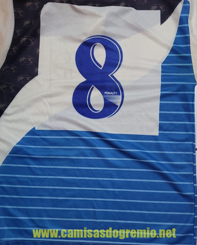 Essa talvez seja uma das camisas mais loucas já vistas por aqui. O molde da camisa Negresco, um escudo retrô fazendo referência ao primeiro escudo da história do Grêmio, mangas brancas, número azul royal… Não tenho mais informações sobre ela, mas que é uma camisa “estranha”, disso tenho certeza.